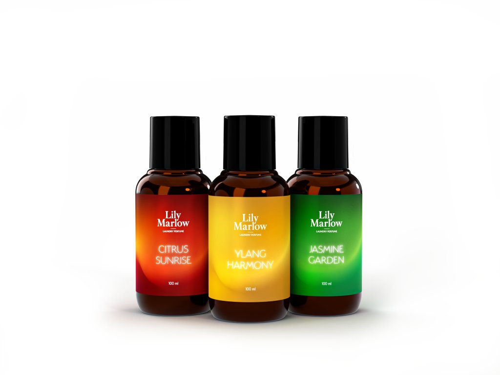 Ciesz się różnorodnością zapachów Lily Marlow w korzystnym zestawie 3×100 ml perfum do prania – YLANG HARMONY, JASMINE GARDEN i CITRUS SUNRISE.